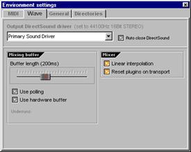 3. Mémoire tampon (Mixing Buffer). Lorsque vous placez le pointeur de la souris sur l’un des boutons de l’illustration ci-dessus, le système affiche l’explication correspondante (à l’exception du réglage Mixing Buffer). Nous allons pour cette raison en expliquer le rôle ici. Pour simplifier : plus le temps alloué à la mémoire tampon est long, moins le son risque d’être saccadé mais plus les réglages apportés à une boucle en lecture mettront de temps à être appliqués. Avec un temps plus court, vous courrez davantage le risque d’obtenir un son saccadé mais vos réglages seront pris en compte plus rapidement. Vous pouvez définir un temps relativement court, mais selon les caractéristiques de votre ordinateur, il est possible que vous ayez à revenir à cette fenêtre (F10) par la suite pour indiquer un temps plus important. Avec un ordinateur rapide et une bonne carte son, vous devriez pouvoir travailler avec une latence d’environ 10 ms. Avec une SoundBlaster Live, vous devriez pouvoir descendre à 30 ms. L’option Use Polling peut également vous permettre d’améliorer le temps de latence. Laissez cette fonction activée si vous utilisez Windows 95 ou 98, mais désactivez-la si vous utilisez Windows 2000.