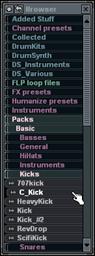 3. Utilisez l’explorateur d’échantillons. L’explorateur d’échantillons (l’autre fenêtre qui s’affiche lorsque vous ouvrez Fruity pour la première fois) vous permet également de charger des échantillons. Cet outil est un explorateur dédié à la sélection et au chargement des échantillons et des boucles. Pour localiser le son C_Kick, cliquez sur Packs, puis Basic et enfin sur Kicks. Faites un clic gauche sur un échantillon pour le jouer, faites un clic droit sur un échantillon pour l’ouvrir sur le canal sélectionné (sélectionnez un canal en cliquant sur le témoin vert, à droite du nom du canal, tel que représenté ci-dessus).