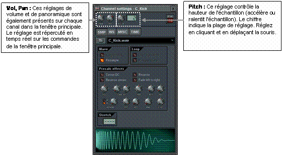 4. Jouez avec les effets des échantillons. Lancez la boucle et jouez sur les commandes de l’onglet de réglage de l’échantillon (SMP) dans la boîte de dialogue Channel Settings pour percevoir l’influence de ces réglages sur le son. La figure ci-dessous présente les descriptions de quelques-unes d’entre elles. Reportez-vous à l’aide en ligne pour obtenir de plus amples informations.