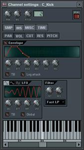 1. Ouvrez la boîte de dialogue Channel Settings. Allez-y, modifiez l’échantillon de grosse caisse. Chargez la boucle GettingStarted1.flp dans sa version originale et cliquez sur le bouton "C_Kick" pour ouvrir la boîte de dialogue Channel Settings de configuration de ce canal (voir ci-dessous).
