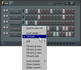 8. Conseil super important. Lorsque vous souhaitez créer une mélodie à partir de longs échantillons, il est souvent préférable de la configurer de telle sorte que chaque note coupe la précédente. Cette opération peut être réalisée très simplement en faisant un clic droit sur le nom du canal dans le séquenceur pas à pas et en sélectionnant l’option Cut Itself dans le menu contextuel. Note : Cette option est déjà sélectionnée sur le canal Ins_Round. Essayez de désélectionner cette option, mais attention le résultat risque d’être assez médiocre !