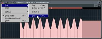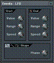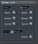 7. Modifiez les réglages dans la fenêtre Events-LFO. Note : Cette boîte de dialogue comporte trois sections. Vous pouvez obtenir des effets très avantageux en modifiant les réglages des sections Start et Shape. La section Start vous permet d’éditer les paramètres Value (hauteur), Range (Profondeur), et Speed (longueur) des ondes. La section Shape vous permet d’éditer la forme des ondes (ondes sinusoïdales, en dents de scie, carrées) et la Phase (déplace les ondes de gauche à droite).