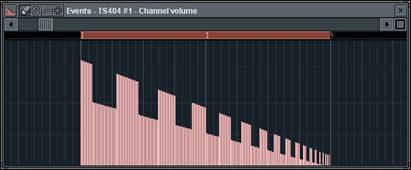 4. Réglage du Volume. Vous pouvez appliquer des effets de fondus entrants et sortants sur le son de certains instruments tout au long d’un Pattern à l’aide du graphique de volume. Essayez d’appliquer cet effet sur un nouveau canal de caisse claire tel que représenté ci-dessous. Rappel : Le raccourci permettant d’ajouter un canal est Alt-S. Le fichier de la caisse claire indiquée ici est sauvegardé sous Packs®Basic®Snares. Ce graphique ne présente pas une valeur moyenne au centre comme le panoramique ; le réglage s’effectue sur une plage comprise entre zéro et une valeur maximale (zéro au bas du graphique). Ces modulations du volume se combinent très bien avec les modulations des filtres de coupures et de résonance. Conseil : Pour tracer une pente homogène dans l’éditeur graphique, faites un clic droit sur la première barre puis faites glisser la souris vers la droite ; les valeurs de toutes les barres sont alors instantanément définies.