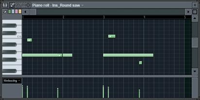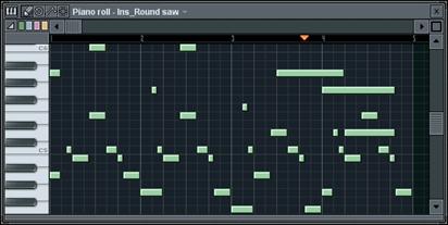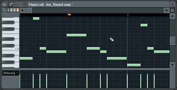 1. Ouvrez l’éditeur Piano Roll. Chargez la boucle GettingStarted6.flp et sélectionnez le Pattern 3. Le séquenceur pas à pas se présente sous un aspect très différent. Cette présentation particulière s’explique par le fait que les canaux Ins_Round et Ins_Square contiennent des données de Piano Roll et plus de simples pas. Vous pouvez ouvrir l’éditeur Piano Roll de chacun de ces canaux en faisant un clic droit sur le nom du canal ou un clic gauche dans la mini fenêtre Piano Roll. Ouvrez la fenêtre Piano Roll du canal Ins_Round.