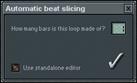 3. Configurez le BeatSlicer. Une fois le rythme sélectionné, la fenêtre ci-dessous s’affiche à l’écran. Sélectionnez tout d’abord le nombre de Patterns (mesures) composant la boucle : maintenez le bouton de la souris enfoncé et faites glisser le pointeur. Si vous souhaitez que le rythme soit “découpé” et directement importé dans Fruity Loops, cliquez sur le bouton de validation. Si vous souhaitez utiliser l’éditeur de découpage du rythme, cochez l’option Use Standalone Editor first (l’éditeur comporte une aide spécifique vous donnant des indications sur cette fonction).